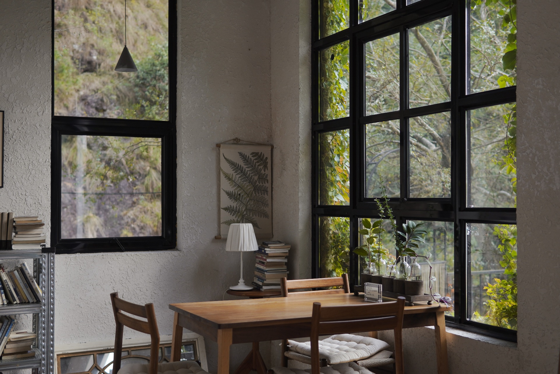 两座房子依山傍水,边上就是一条小溪流和一颗大榆树。两个房子都是白墙青瓦,房子中间的空地可以生篝火。一边房子二楼是客房,一楼是很大的开放式厨房和餐厅。虽说是厨房餐厅,但是窗户很大很多,开放式空间也一点不会感到压抑。还通过软装分出几个小空间区域。比如有一个小沙发的 live room,一个超大的岛台可以做一些料理、冲咖啡之类的。右边有一快很小但是我很喜欢的区域,有一扇很大的大窗,柜子和书架都摆了一些旧书,都是房主的私藏。