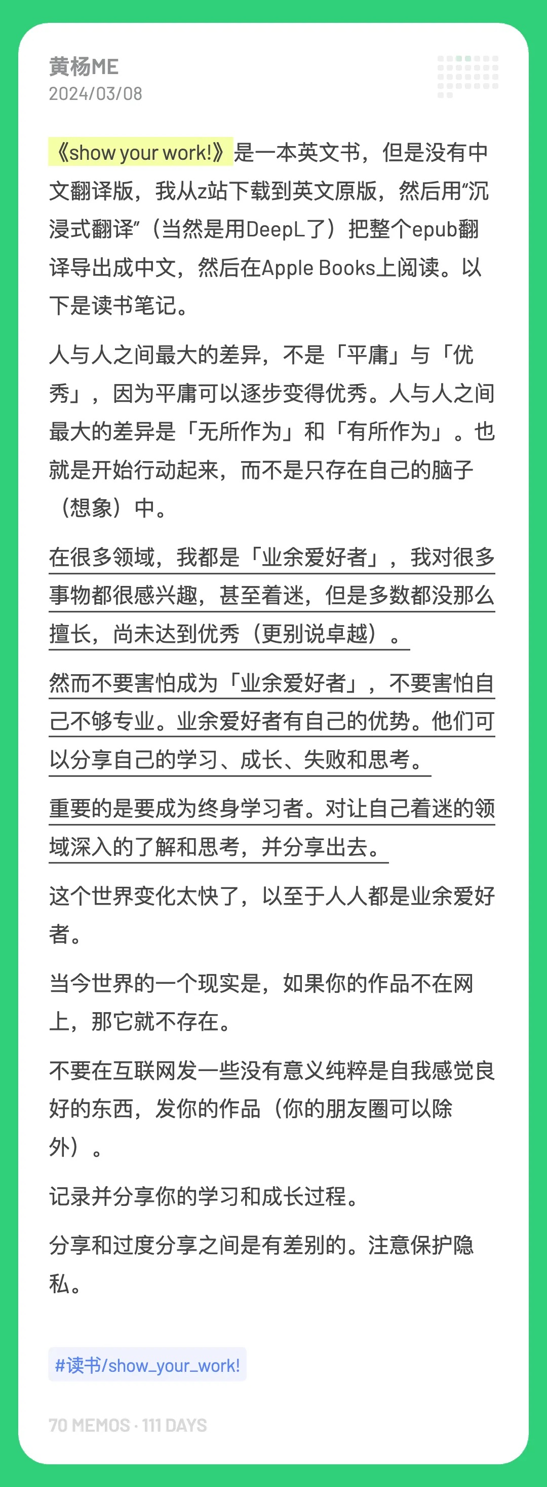 这个观点跟我前段时间看的一本书 《show your work!》 中的观点有些不谋而合。下面是我看这本书时在 flomo 记的笔记。